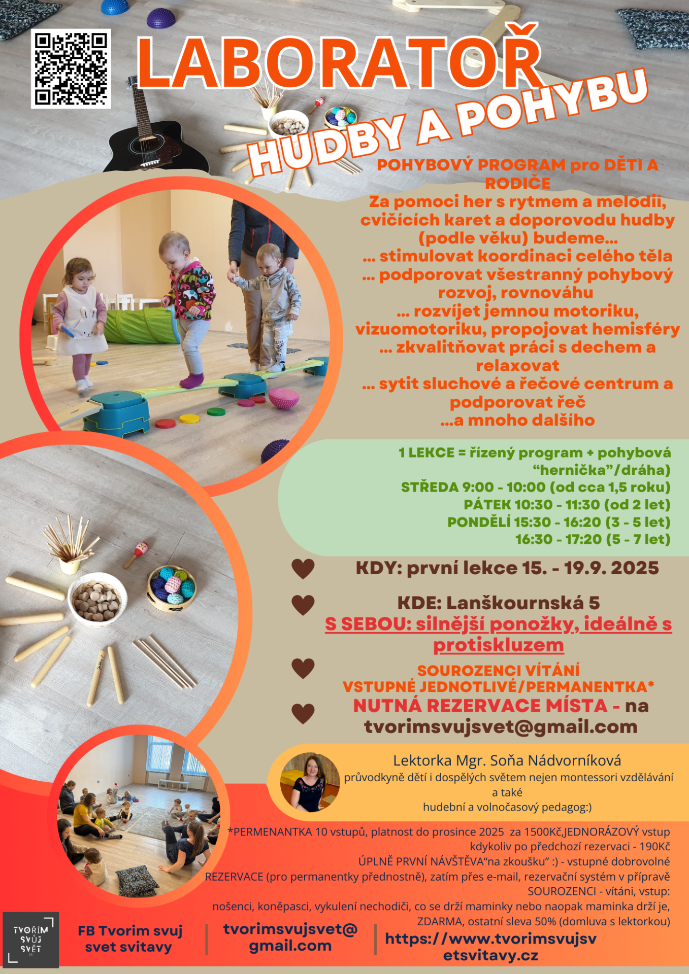 "Takový kroužek jsem si vždycky přála pro svoje děti. Kroužek, kde bychom se hýbali proto, že chceme mít zdravé a funkční tělo a radost z pohybu. Bez tlaku na výkon nebo výsledky, s radostí, v čem jsme se posunuli, co už se nám daří, s pořádnou dávkou endorfinů, které pohyb - spojený navíc s hudbou - přináší. Začala dělat se svými dětmi v obýváku :-) . Návštěvy u nás měly k dispozici dvě křesla a pak si mohly vybrat, jestli využijí houpací prkno, pikler triangl, balanční čočku, nebo budou raději chodit po smyslových chodníčcích....Tušíte správně, "obývák" jsme říkali už jen ze zvyku. Proč to všechno? Mé hlavní motivační motory ("vytuněné" roky covidových lockdownů se třemi dětmi doma) a byly dva.