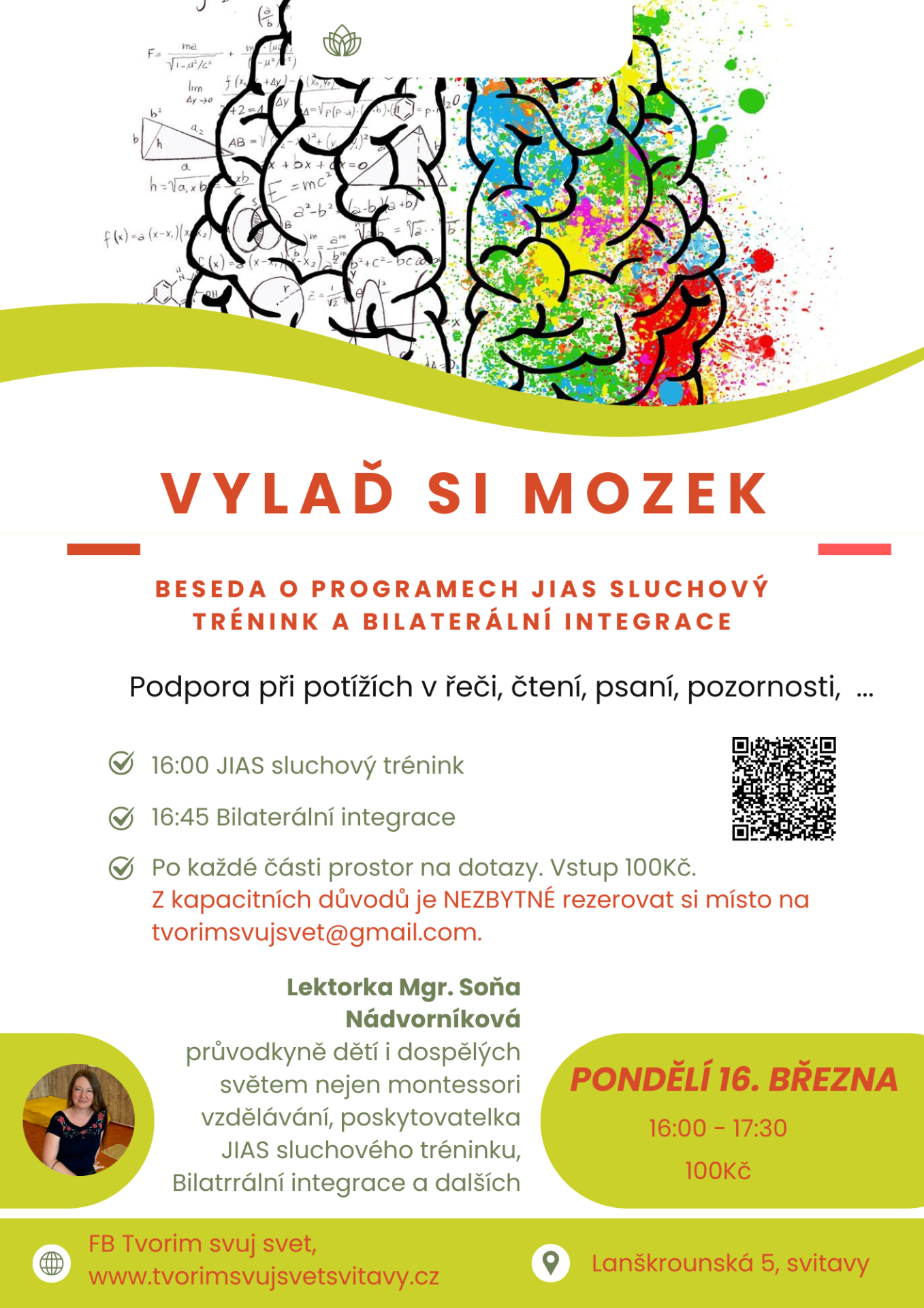 Přijďte se o programech a o tom, jestli by mohli pomoci právě vám dozvědět víc v pondělí 16. března od 16:00 do 17:30. Z kapacitních důvodů je nutné se přihlásit na tvorimsvujsvet@gmail.com. Abychom v těchto nových tématech podpořili osvětu, vstupné je pouze za provozní náklady - 100Kč.